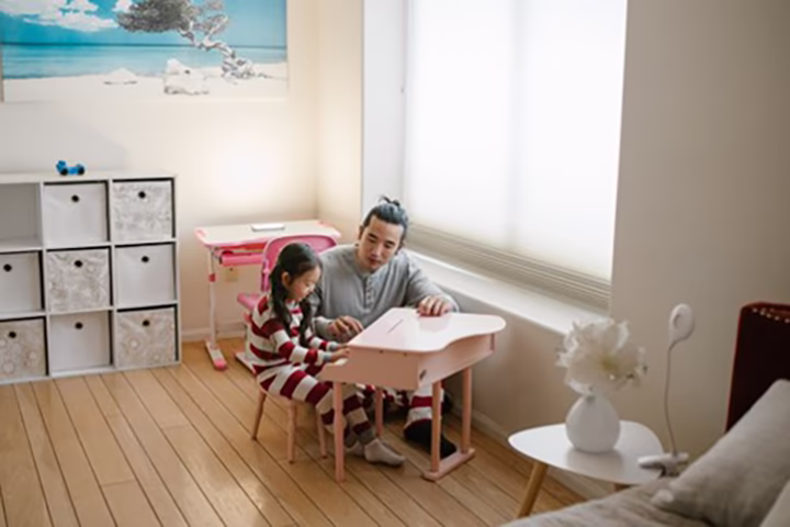 - Biurko / stolik ustawiamy przy oknie – światło z boku (z lewej strony dla praworęcznego dziecka, z prawej dla leworęcznego), blat równolegle do ściany z oknem lub pod nim.